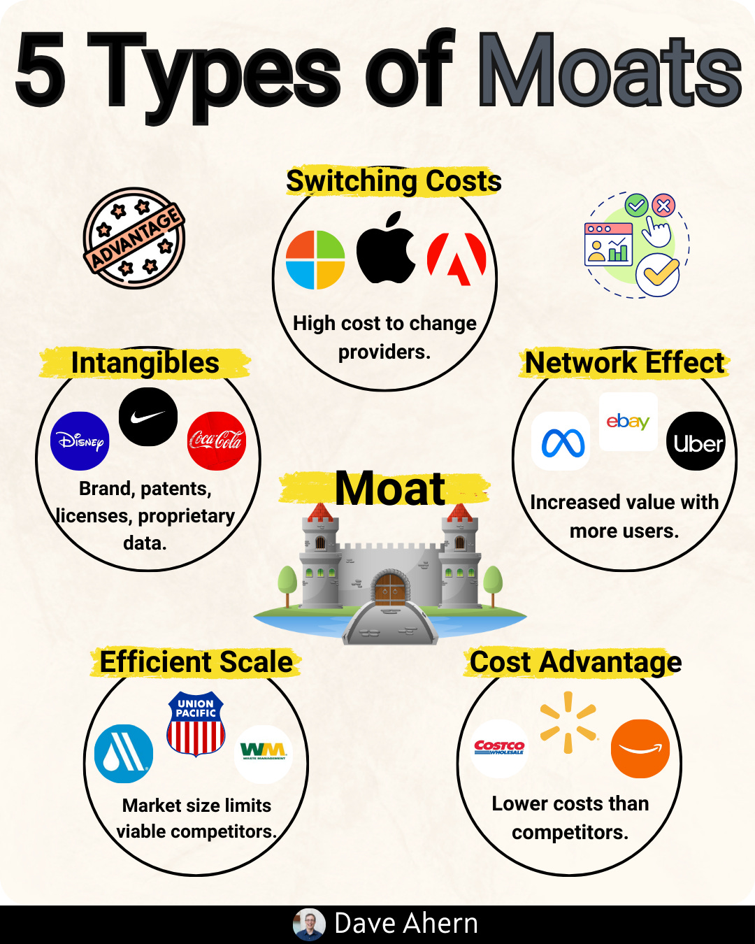 Source of advantage: Cost (scale, scope, unique assets)? Brand (pricing power, loyalty)? Network effects (user-to-user value)? Switching costs (integration, learning curve)? Regulations (licenses, IP)?