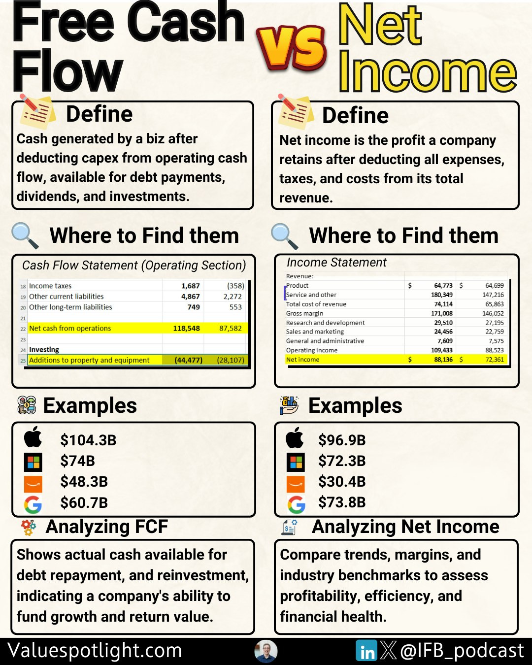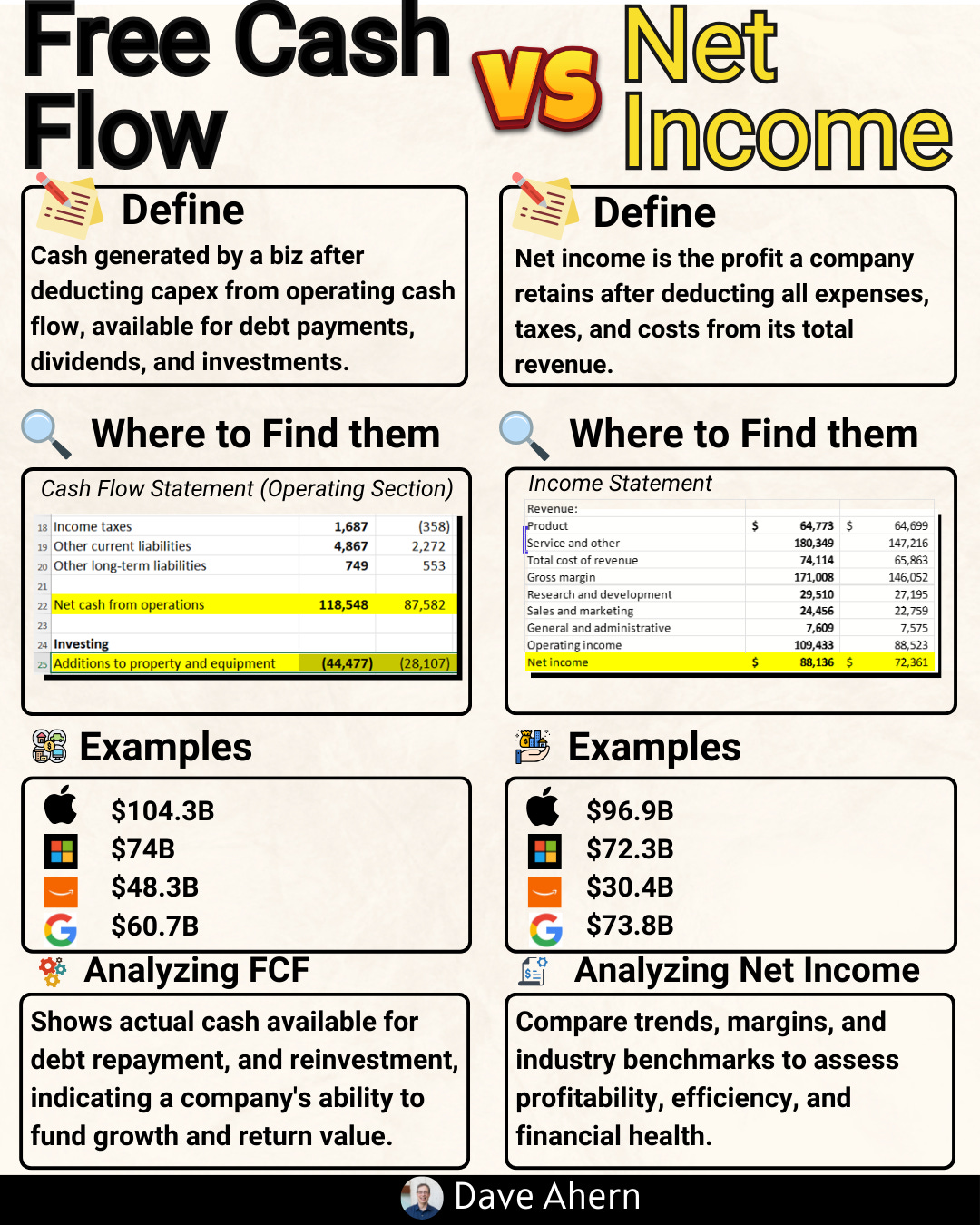 Free cash flow, on the other hand, shows actual cash. It tells you how much money is available right now for paying bills, dividends, or reinvesting back into the company.