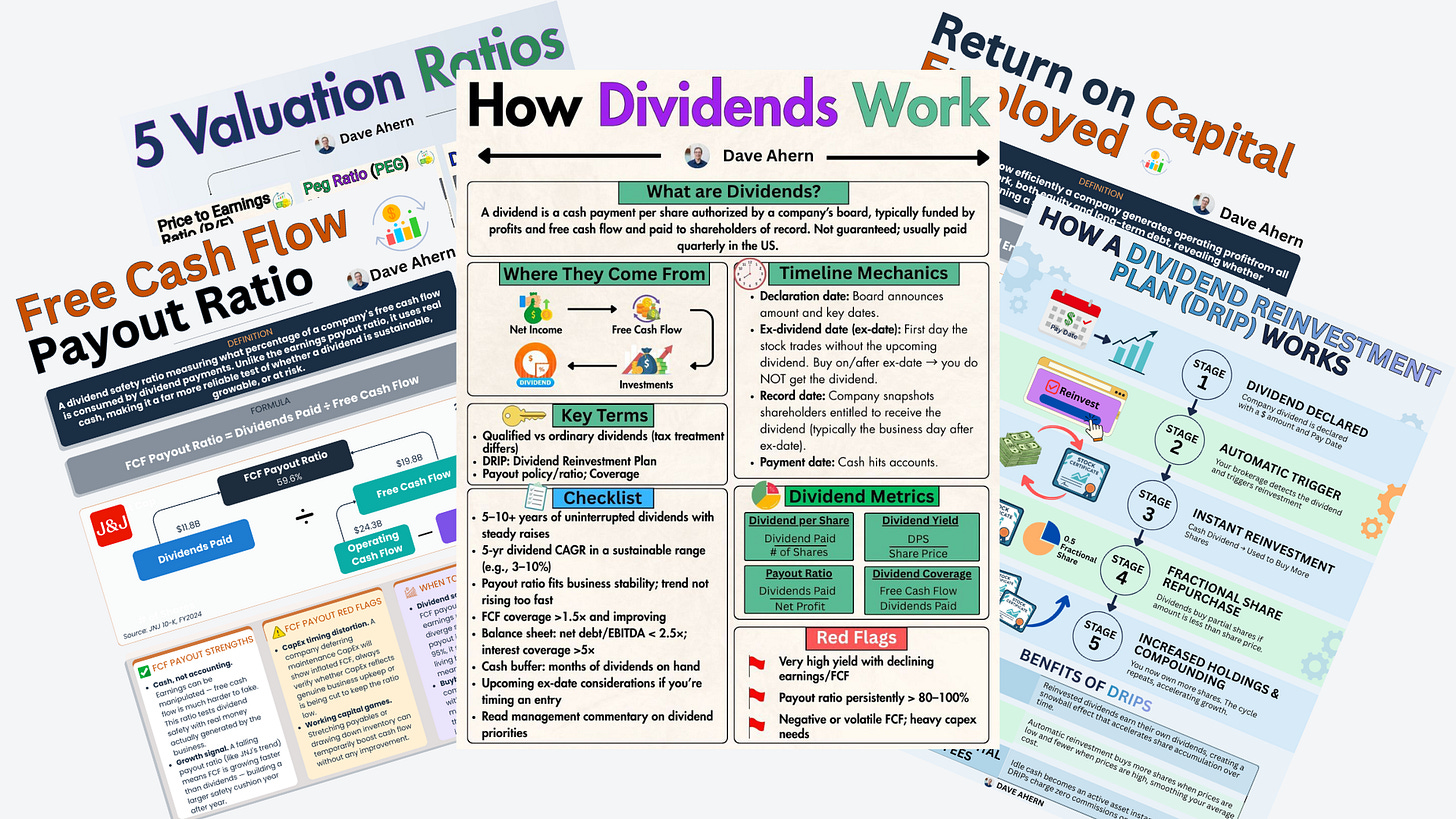 Before you touch a single number, you need to know which metrics matter for dividend stocks and what they’re telling you. Payout ratio, free cash flow yield, debt-to-equity, dividend growth rate, return on invested capital — these aren’t just vocabulary words. Each one answers a specific question about a company’s ability to pay, grow, and sustain its dividend.