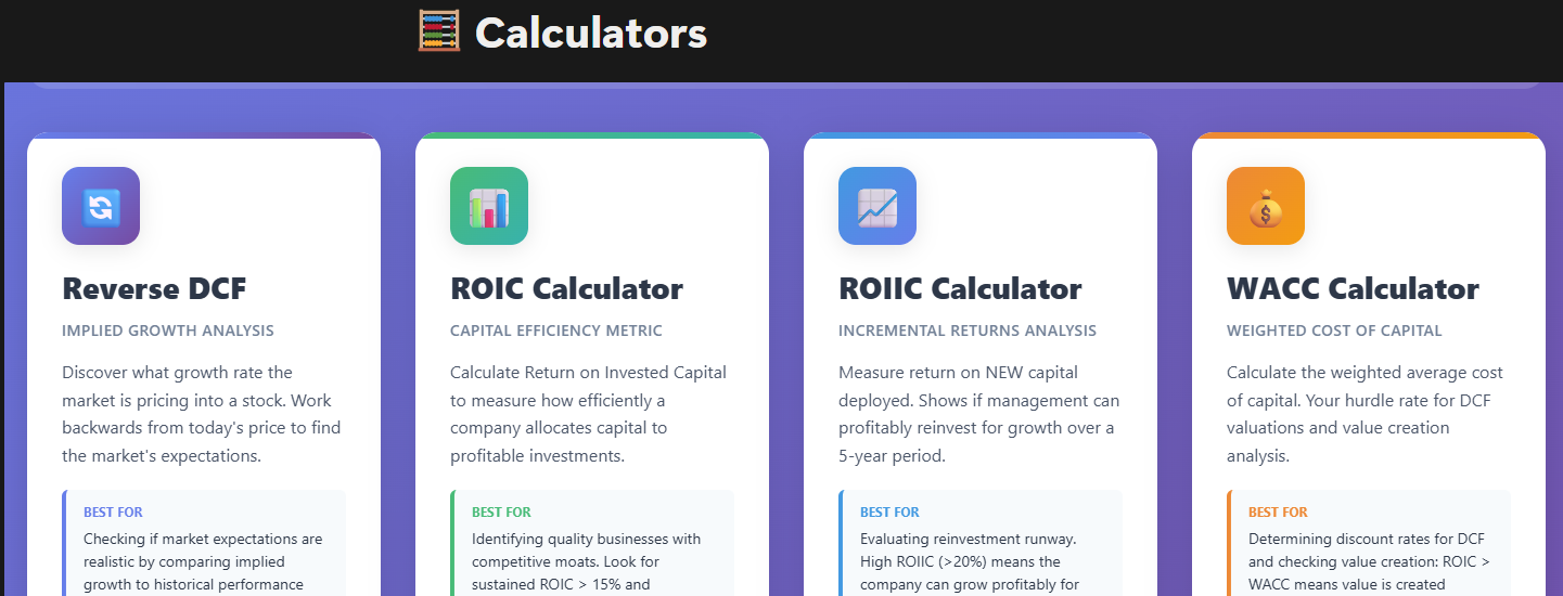 That’s been the problem I’ve been trying to solve for the last several years. Not just teaching concepts, but building the actual resources that let someone sit down with a company and do the work. Visual references that make the concepts stick. Calculators that handle the math. Research frameworks that challenge your assumptions. Real company walkthroughs that show the process in action.