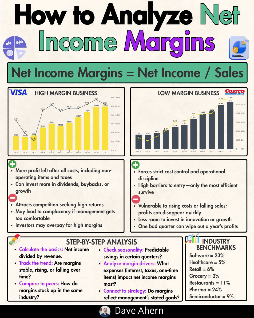 The Net Profit Margin (Net Income / Revenue) x 100 tells you what percentage of every dollar in sales becomes pure profit.