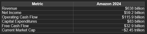 Look at that CapEx figure: $83 billion! Amazon is spending massive amounts building data centers, warehouses, and logistics infrastructure. This explains the gap between operating cash flow ($115.9 billion) and free cash flow ($32.9 billion).