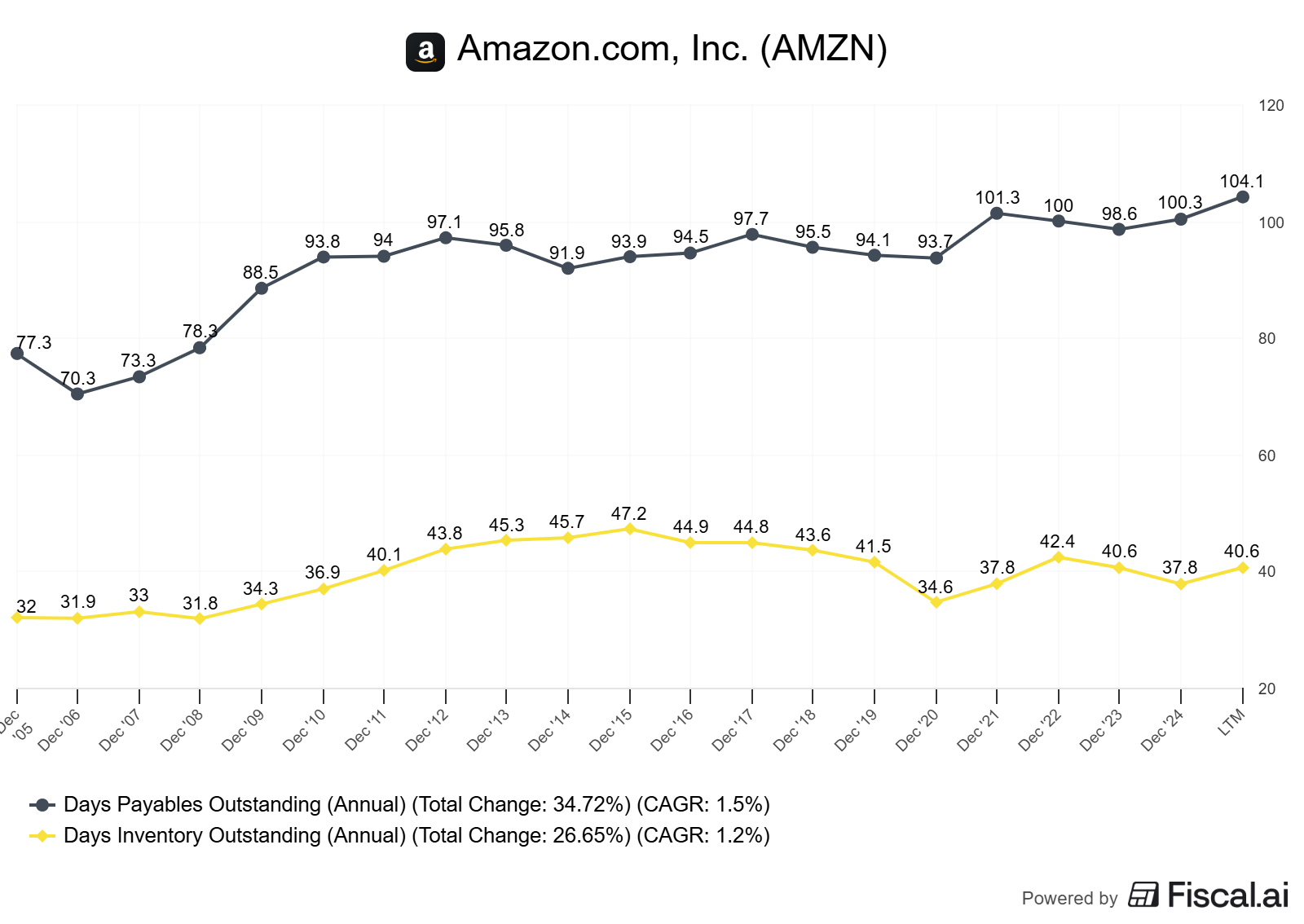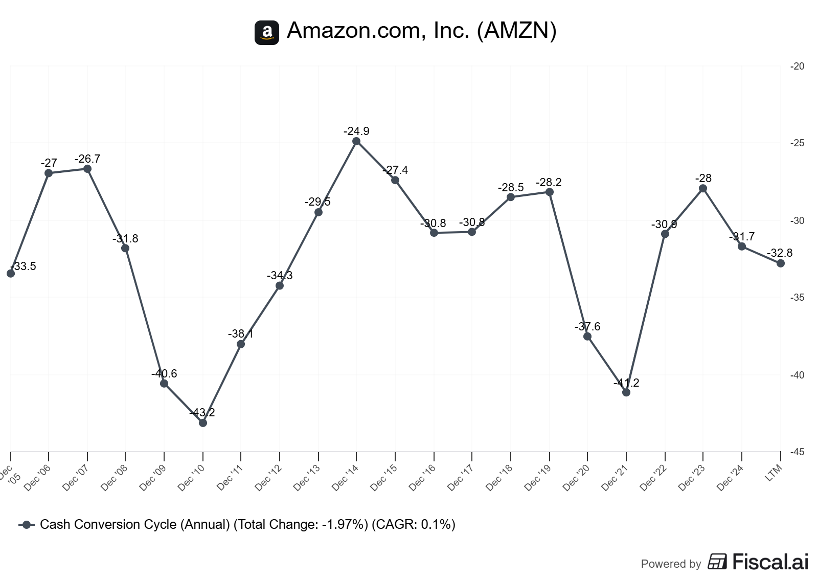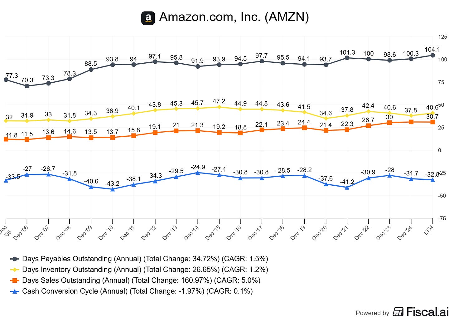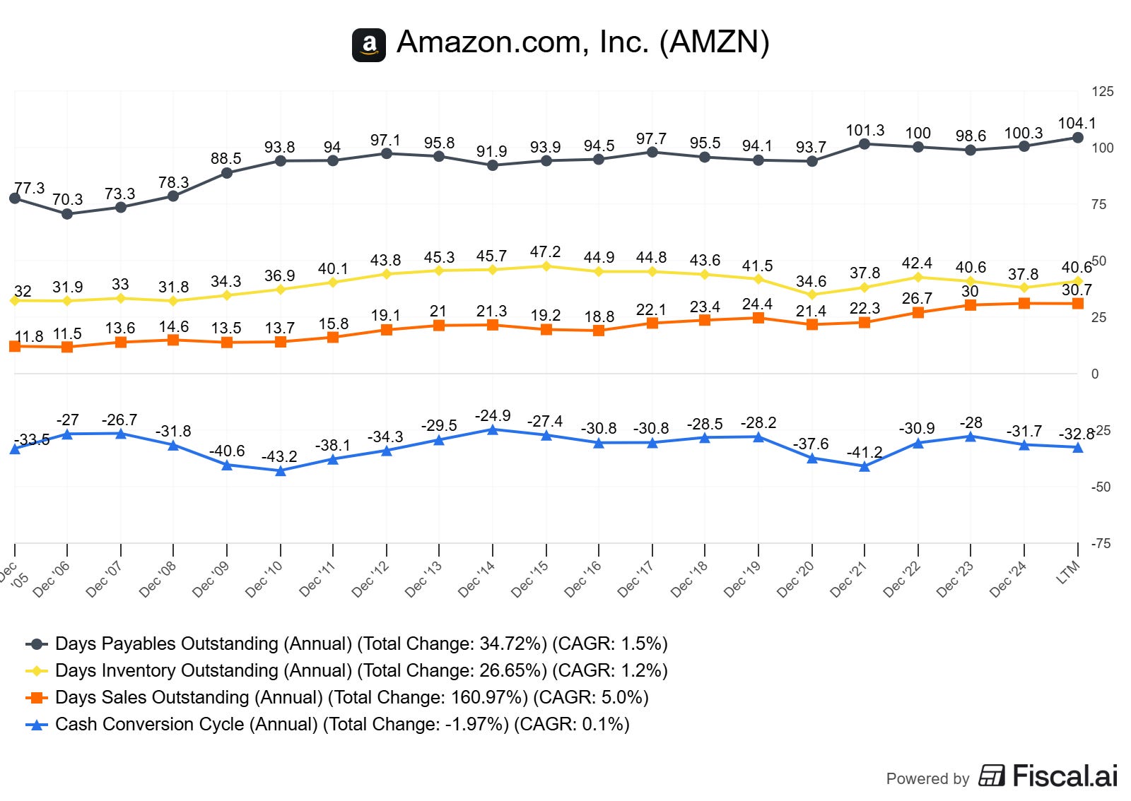 Amazon’s retail operations benefit from a structurally negative CCC driven by large payables to suppliers and fast inventory turns; the marketplace model and AWS have different dynamics.