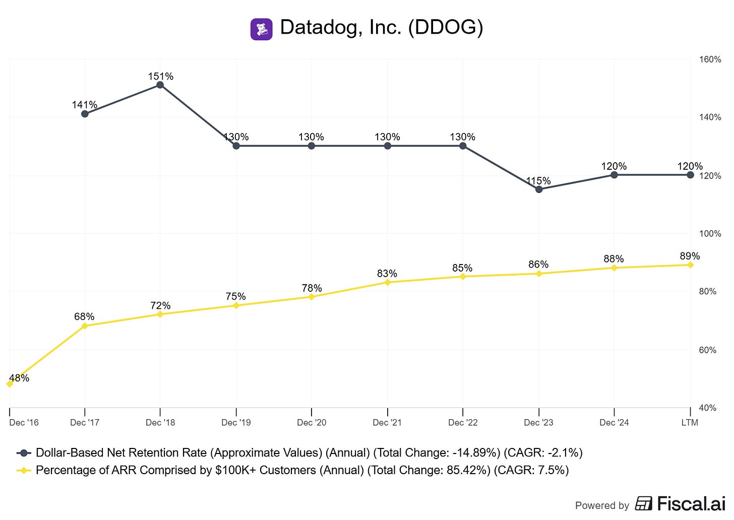For Datadog, stickiness shows up in multi-product adoption, large-customer expansion, high gross revenue retention, and strong FCF conversion (31–33% in recent quarters) [as of 2024–2025] (Datadog PR via Nasdaq, Q1’24 transcript).