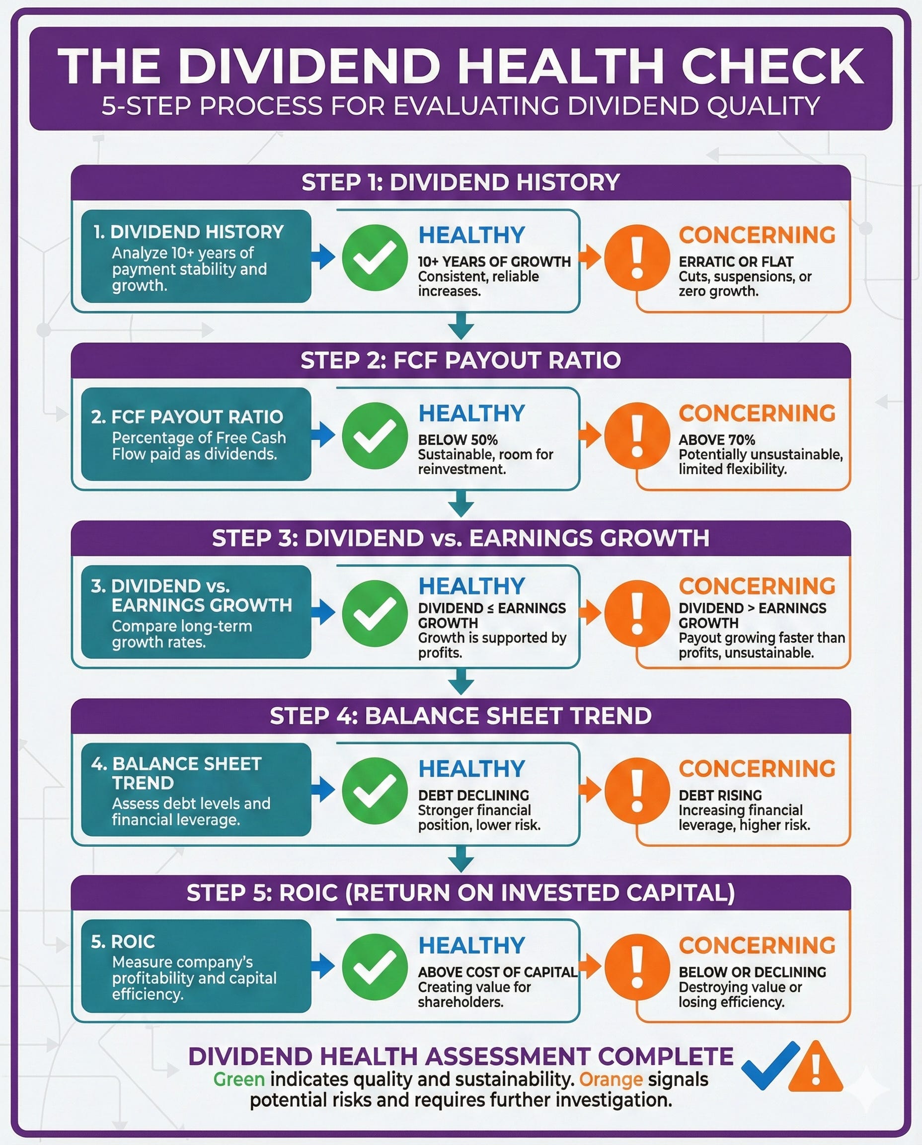 A growing dividend backed by growing free cash flow, a low payout ratio, and strong ROIC tells you the business is healthy, and management is confident. A high yield with a deteriorating balance sheet and declining cash flow tells you the market sees trouble ahead, even if the checks are still arriving.
