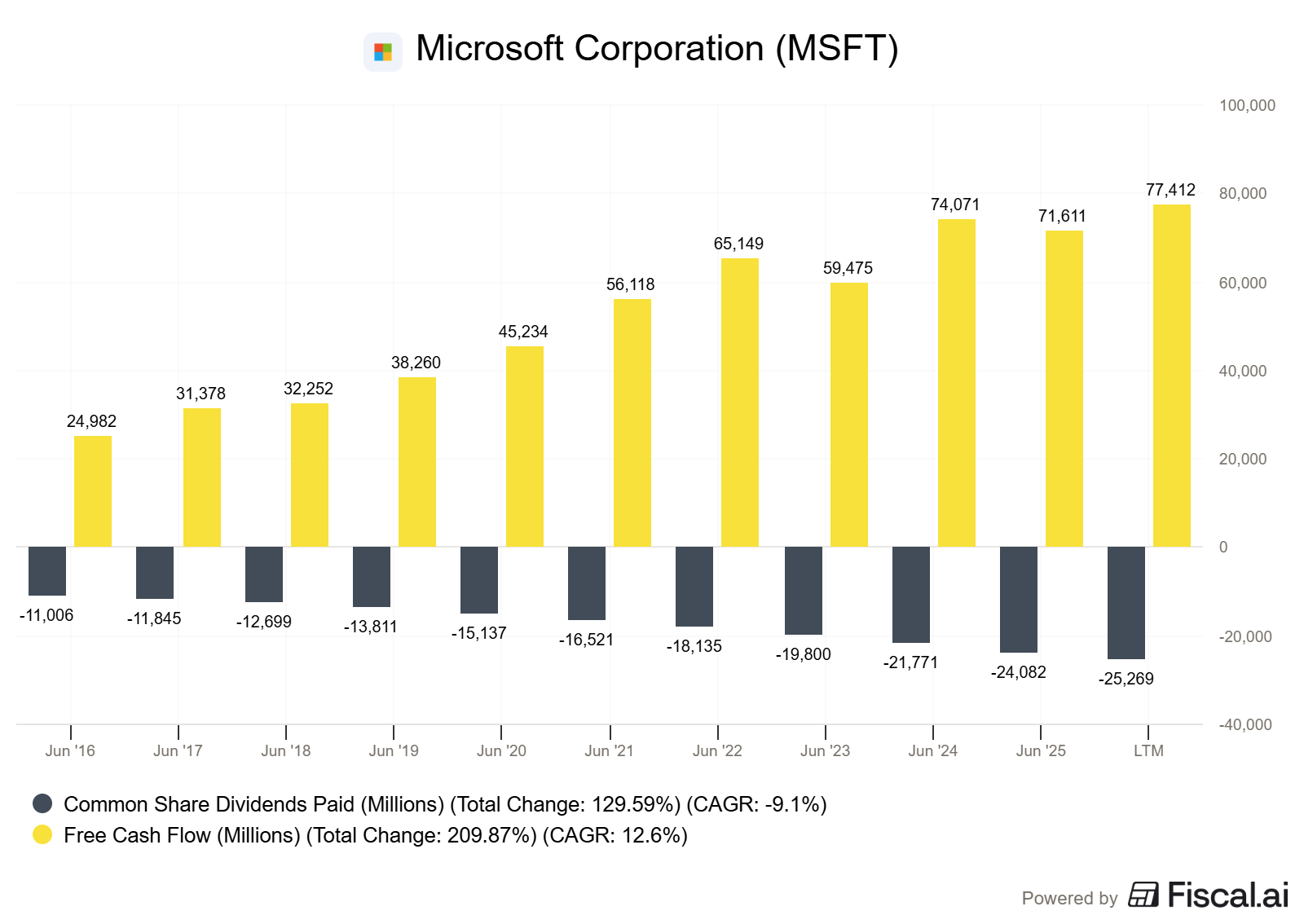 Microsoft’s yield has typically been modest (usually between 0.7% and 1.2% in recent years) because the stock price keeps rising alongside earnings growth. The low yield isn’t a weakness. It’s a reflection of a business compounding so effectively that the stock price growth outpaces the dividend growth.